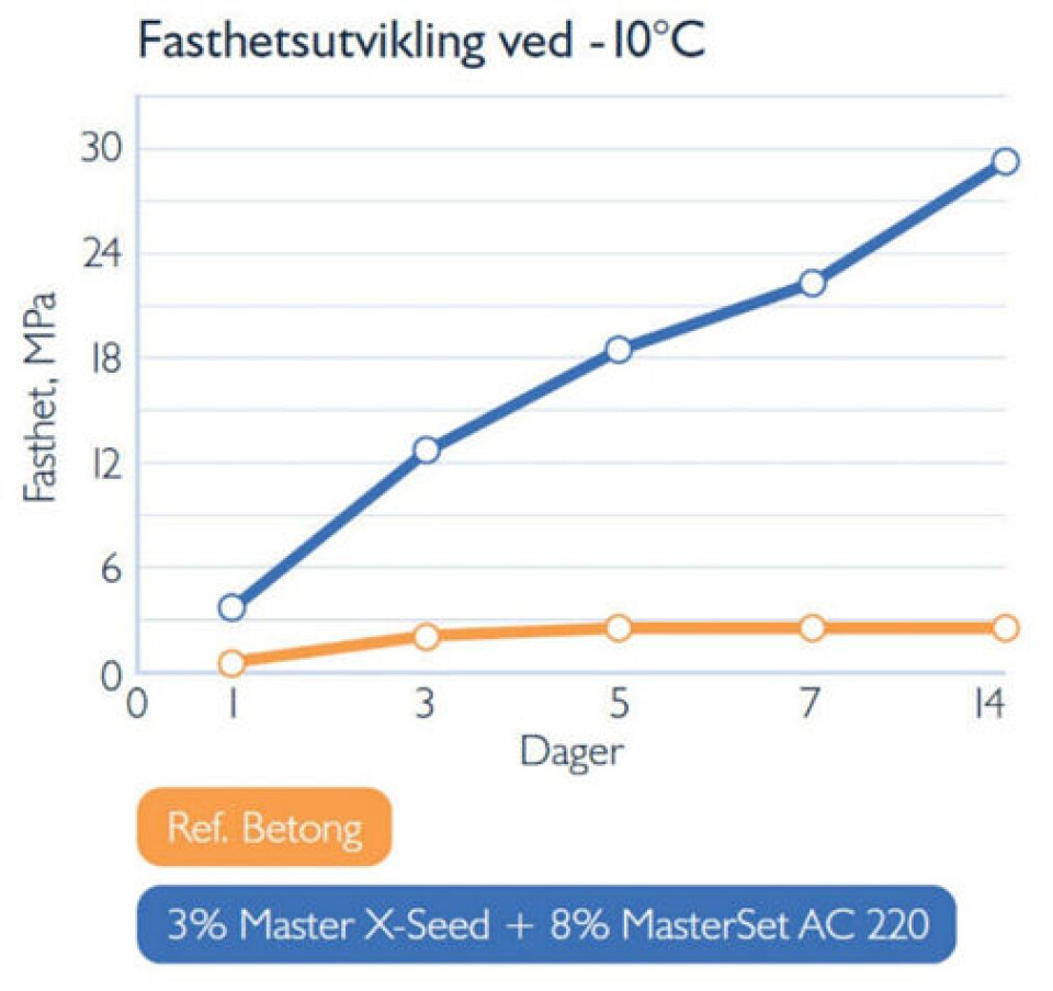 Patentert styrkeakseleratorProblemet kan løses ved å anvendelse av den patenterte styrkeakseleratoren Master X-Seed i betongen - gjerne sammen med et frysepunktnedsettende produkt som MasterSet AC 220. Master X-Seed akselerer herdeprosessen fysisk og gjør den mer forutsigbar. Herdefasen starter på et tidlig stadium der sementhydratisering sørger for den nødvendige varmeutviklingen i betongen. På den måten fortsetter hydratiseringsprosessen på samme måte som under vanlige forhold, også ved lave temperaturer. Samtidig forebygger Master X-Seed de skadelige virkningene av tradisjonelle akseleratorer, som reagerer kjemisk.